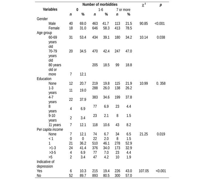 Table 4 presents the number of morbidities according to socioeconomic variables and indicative of depression. The majority of the elderly had 1-6 morbidities (65.5%) followed by seven or more (31.1%). The elderly, female, 70-79 years old, who received a minimum wage and had an indication of depression presented more morbidities compared to the others.