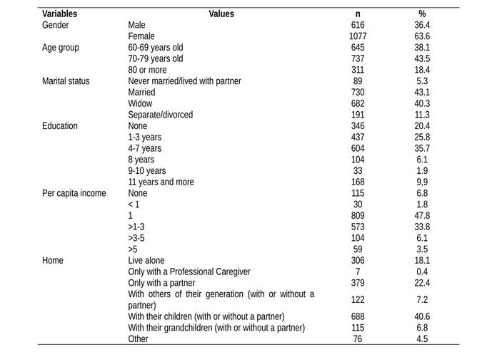 There was a female elderly prevalence, aged 70-79 years old, married, living with their children, with 4-7 years of education and income of a minimum wage. Table 1 shows the socioeconomic and demographic variables of the elderly.