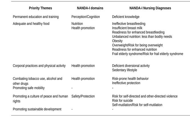 PNPS and NANDA-I nursing diagnoses. The PNPS update made it possible to recognize current issues in Brazilian society that need attention from public health policies and other political sectors, as well as the participation of the private sector and the community. The priority themes of the current PNPS are: permanent education and training, adequate and healthy nutrition, corporal practices and physical activity, combating tobacco, alcohol and other drugs, promoting safe mobility, promoting a culture of peace and human rights, and promoting sustainable development.2 The relationship between the priority issues of the national policy and the NANDA-I diagnoses are set out in the table below for a better view.