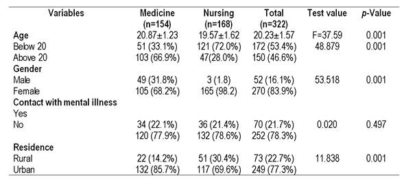 The sample in the present study comprised of undergraduate students (N=322) of whom 52.1% were nursing students (n=168). The mean age of the nursing students (19.57) was lesser than mean age of the medical students (20.87). More number of nursing students was aged below 20 yrs (72%) compared to 33.1% of medical students ((2 = 48.879, p<0 .001). A vast majority of the participants were women (83.9%) and were from nursing course ((2= 53.518, p< 0.001). Nearly one fourth of the students from the both groups agreed that they know persons with mental illness. Majority of the medical students (85.7%) than nursing were from urban background ((2= 11.838, p< 0.001).