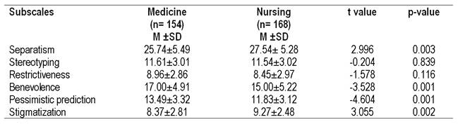 Métodos: . Se realizou um estudo descritivo de tipo transversal com estudantes de Medicina (n=154) e de Enfermagem (n=168). Se utilizou a Attitude Scale for Mental Illness (ASMI) a qual tem 34 itens divididos em seis domínios: Separatismo, Estereótipos, Restrição, Benevolência, Predição pessimista e Estigmatização. As opções de resposta são tipo Likert e vão desde totalmente em desacordo (1) a totalmente de acordo (5). A menor pontuação é melhor a atitude positiva para as pessoas com doenças mentais.