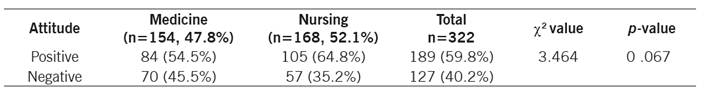 Statistical analysis. The response of the benevolence domain was reverse coded before the analysis. The data were analyzed using appropriate statistical software and results were presented in narratives and tables. The t-test was used to determine whether significant differences existed between medical and nursing students regarding their mean attitudes scores. Chi-Square test was used to find the significant association between socio-demographic variables. Statistical significance was assumed at p<0.05.