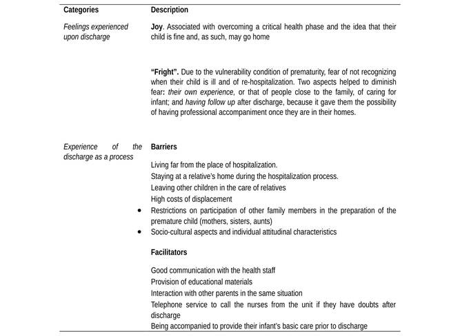 Results. : The following categories emerged from the analysis of the information: feelings experienced upon discharge, and experience of the discharge as a process; the latter category clearly identified barriers and facilitators. The results highlight that the parents experience ambivalent feelings; joy is mixed with the fear of caring for a premature child at home.