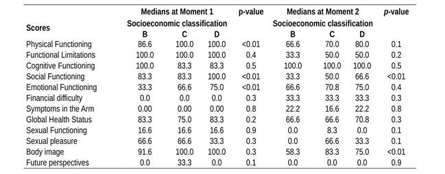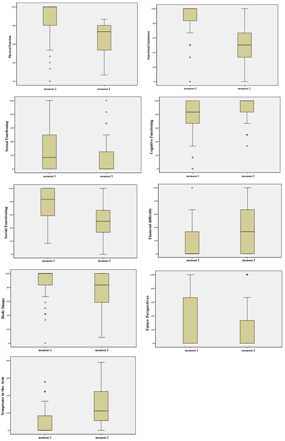 Table 2 shows the socio-demographic data of the interviewees. Figure 1 shows the medians of the statistically significant dimensions by the Wilcoxon test, when compared to the preoperative and postoperative dimensions, Physical Function, Functional Limitations, Social Function, Sexual Function, Financial Difficulty, Body Image and Symptoms in the Arm presented worsening after the surgery. The Cognitive Functioning Dimensions and Future Perspectives improved in the postoperative period.
