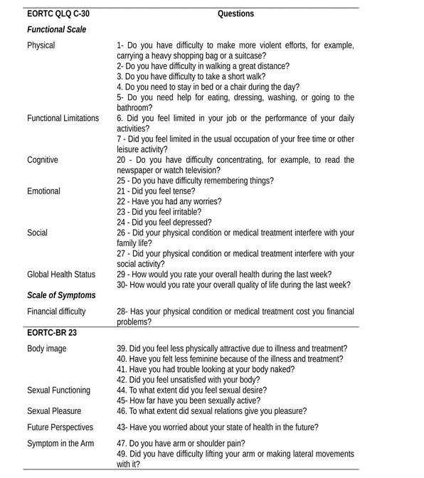 The second instrument is a specific module for breast cancer, which was translated and validated in 2007, published in 201314, and composed of 23 questions divided into three groups. The first group investigated secondary symptoms to systemic therapy, so they were not evaluated. The whole second group was used, integrating: Sexual Function, Sexual Pleasure, Body Image and Future Perspectives, and the third group was used the Symptom in the Arm dimension.