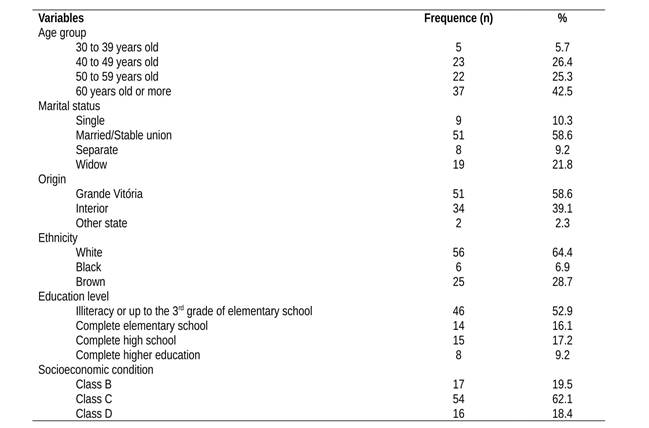 This is a longitudinal study, carried out at the Ylza Bianco outpatient clinic of the Santa Rita de Cássia Hospital (HSRC), maintained by the Feminine Association of Education and Fight against Cancer (Afecc) - Vitória - ES. HSRC is a philanthropic entity recognized throughout the state as a reference in cancer treatment, and it also offers general specialties. The population was composed of 87 (eighty-seven) women diagnosed with breast cancer and who underwent quadrantectomy or mastectomy in 2012 at HSRC. The inclusion criteria included women who were 18 years old or older, who had a diagnosis of breast cancer without previous treatment, and who were in the preparation phase for tumor removal surgery.