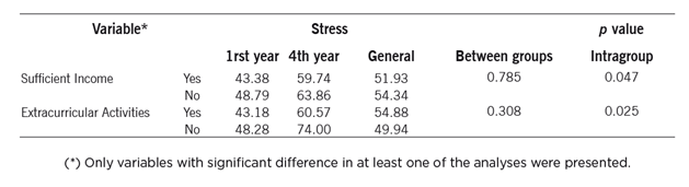 Insufficient monthly income for maintenance and realization of extracurricular activities contributes to increased levels of stress, both in the first and the fourth year of the course. Income influences, to different degrees, factors that contribute to reducing stress levels such as access to cultural and leisure activities and sports. This relationship was evident in a study with 160 nursing students in São Paulo where higher stress levels were seen in students who did not share in leisure activities and sports.4 In this sense, by limiting the access of individuals to socio-cultural and sports activities, insufficient income contributes to higher levels of stress, reducing the students' academic performance and quality of life.13