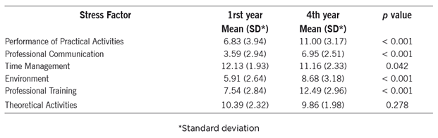 It is observed that the performance of practical activities, professional communication, environment and professional training cause greater stress to the fourth-year students than first-year students. In turn, time management implies a higher level of stress for first-year students. Although the mean stress in the factor theoretical activity was higher in first-year students, no statistically significant difference was observed between groups.