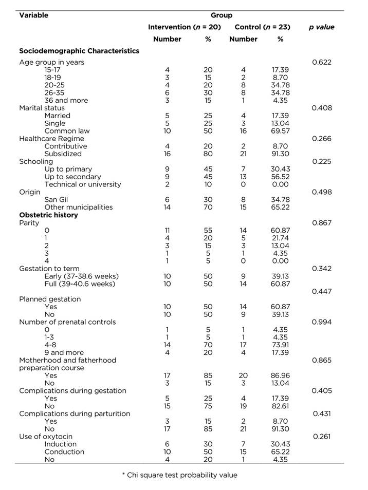 The mean age in the intervention group was 25.15±7.91 years versus 24.35±5.77 years in the control group (p = 0.893). Table 1 shows that the groups are similar regarding the sociodemographic variables and obstetric history. Most of the women in both groups are between 20 and 35 years of age, are registered in the subsidized regime and report their level of studies to complete secondary. Other common characteristics in these women is that they come from municipalities near San Gil to have their first parturition, with gestations at full term, having as antecedents compliance of prenatal controls and attendance to the motherhood and fatherhood preparation course. Principally, the women in both study groups had no complications during gestation or labor. The parturition lasted 14.85±12.11 h in the intervention group versus 17.65±10.45 h in the control group (p=0.420), with this difference not being statistically significant.
