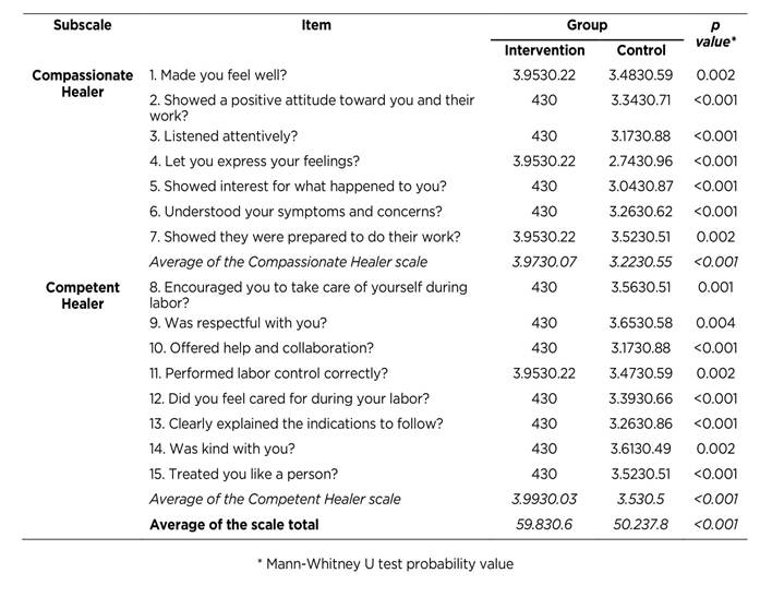 In the Competent Healer subscale for the control group, the lowest average scores were: 13- Clearly explained the indications to follow?; and 10- Offered help and collaboration?, which calls on nurses in general to improve in the education and direct care of women during parturition process; these scores obtained a classification of Excellent in the intervention group. It should be remembered that women who do not feel cared for by nurses report development of postpartum post-traumatic stress (7, which drives to continue delving into this care intervention and its benefits during the parturition process, expulsion and in the immediate, middle and late postpartum.