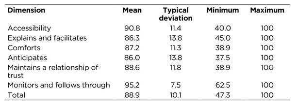 The statistical analysis was conducted with the SPSS software v. 23; absolute and relative frequencies were calculated for each of the items of the scale and central tendency and dispersion measurements were made for the total and the dimensions. To calculate the total scale score, the scores of the items were added and this was divided by the sum of the maximum score, this result was multiplied by 100. The same procedure was conducted for each dimension. For the total score and by dimensions, of the lost data were replaced by the average evaluation of the items that make up the dimension. It was considered that a higher score indicates better perception of the quality of nursing care provided. Additionally, Cronbach’s alpha of 0.96 for the scale total was calculated as internal consistency indicator, and per dimensions the scores were: accessible α = 0.72, explains and facilitates α = 0.69, comforts α = 0.81, anticipates α = 0.86, maintains a relationship of trust α = 0.82, monitors and follows through α = 0.79.