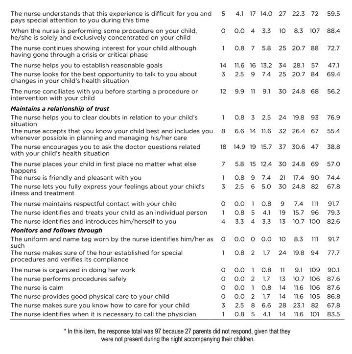 In the Comforts dimension, 88.4% states that the nurse is always kind with their child in spite of having difficult situations. It is striking that only 22.3% of the parents expressed that the staff always sits with them to start a conversation. In the Anticipates dimension, the lowest percentages in the always item, were for the item when you feel overwhelmed by your child’s illness, the nurse agrees with you on a new intervention plan (42.1%) and the nurse helps you to establish reasonable goals (47.1%). In the Maintains a relationship of trust dimension, the items with the highest scores were: the nurse maintain respectful contact with your child (always = 91.7%) and the nurse identifies and introduces him/herself to you (always = 81.6%). The lowest evaluation was given to the item the nurse encourages you to ask the doctor questions related with your child’s health situation (always = 38.8%). Lastly, the Monitors and follows through dimension highlights that 90.1% of the parents indicated always in the item the nurse is organized in doing his/her work, while only 67.8% indicate that the nurse makes sure you know how to care for your child.