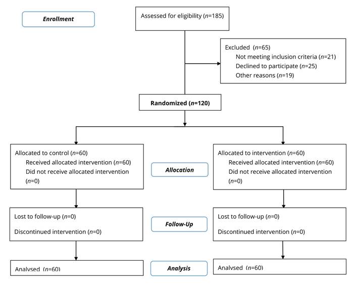 After obtaining written consent from the university authorities, the researcher obtained the consent of hospital officials as well. Random allocation of the intervention method was used to select 120 nurses who were assigned to intervention (n=60) and control groups (n=60). Figure 1 presents the study flow diagram.
