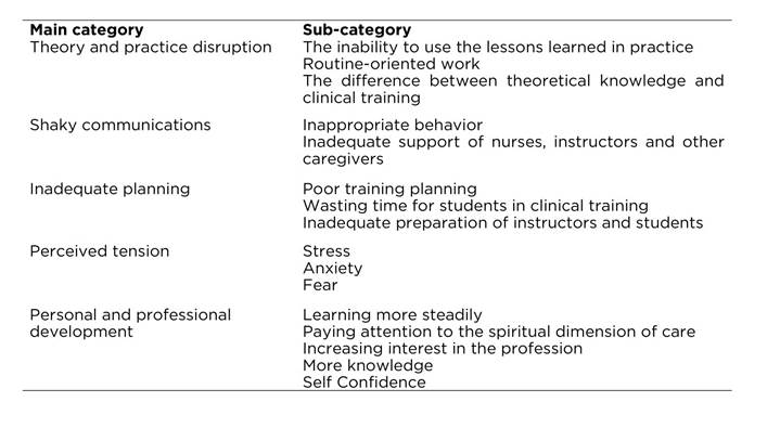 Results : From this study five categories were emerged: Theory and practice disruption (The inability to use the lessons learned in practice, Routine-oriented work, The difference between theoretical knowledge and clinical training), Shaky communications (Inappropriate behavior, Inadequate support of nurses, instructors and other caregivers), Inadequate planning (Wasting time for students in clinical training, Inadequate preparation of instructors and students), Perceived tension (Stress, Anxiety and Fear), Personal and professional development (Learning more steadily, Paying attention to the spiritual dimension of care, Increasing interest in the profession, More knowledge, greater Self Confidence).