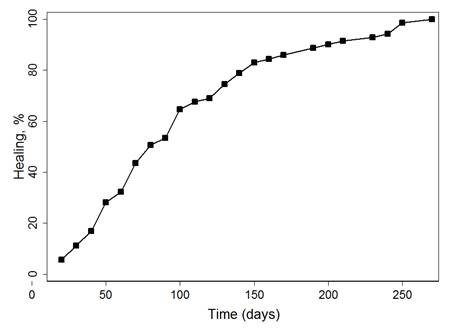 The Kaplan-Meier method was used to obtain the estimations of the cicatrization process from each of the evaluations of the 80 patients, of which 71 had cicatrization and nine were censored (due to loss and due to not presenting the event upon ending the follow up). The variable of follow up time had abnormal behavior of the data (Shapiro-Wilk test <0.0001). It was found that the median of the cicatrization time was 78 days (minimum = 14 days and maximum = 264 days, percentile 25 = 48 days and percentile 75 = 130 days). Graphic 2 shows the cicatrization in function of time, which exposes that the probability of an individual to healing increases over time.