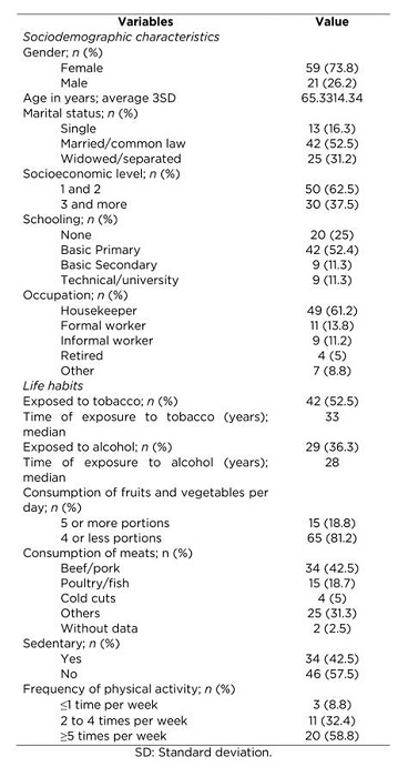The study evaluated 80 patients with UVE. All had at least one UVE, with a median of six months of antiquity. Table 1 shows the general characteristics of the participants. There was prevalence of female participants, married, low socioeconomic level, low schooling, and housekeeper as occupation. The mean age for this group was 65 years (minimum = 18 and maximum = 90). In life habits, there was higher frequency of tobacco consumption than alcohol, poor consumption of fruits and vegetables, high intake of beef and pork, as well as poor engagement in physical activity.