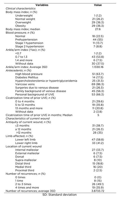 Methods : Multi-center, prospective cohort study with participation of 80 patients with UVE assessed in three clinics from the city of Medellín (Colombia). Sociodemographic conditions were characterized and the clinical characteristics of the wounds evaluated with the Resvech 2.0 scale.