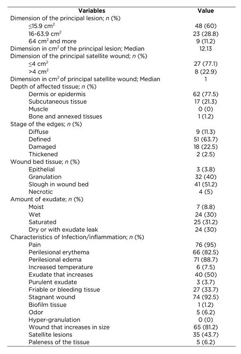 Table 3 shows information of the UVE during basal evaluation. It was found that 60% of these wounds measured less than 16 cm2; the greatest affection occurred in the epidermis (77.5%), defined edges were present in 63.7%, slough was found in the wound in 51.2%, and 31.2% had saturated exudate. Infection and inflammation characteristics showed that the wound caused pain (95%), with erythema and perilesional edema (82.5% and 88.7%, respectively). Likewise, other characteristics were found, like presence of wound that did not diminish in size in 92.5% and wound that increases in size in 81.2% of the patients.
