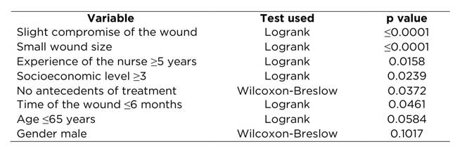 To establish the variables that should be entered into the Cox proportional risk model, comparison was made of the cicatrization time with the variables dichotomized through the Logrank and Wilcoxon-Breslow tests. The first test was used when the graphics suggested differences in survival of the groups compared, the second test was used to find the statistic when it was not possible to establish that difference among groups. The variables shown in Table 4 were finally selected.
