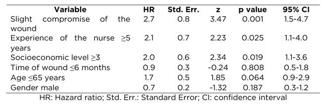 Resultados: El 48.7% de los pacientes (52.5% de las mujeres y el 38.1% de los hombres) tuvieron éxito en la cicatrización de la lesión en un tiempo máximo de 90 días. El modelo de riesgos proporcionales de Cox mostró que el tiempo de cicatrización era mayor en los pacientes pertenecientes a estrato socioeconómico bajo (HR=2.0), con lesiones de mayor compromiso (HR=2.7) y quienes fueron tratados por enfermeros con experiencia menor de 5 años (HR=2.1).