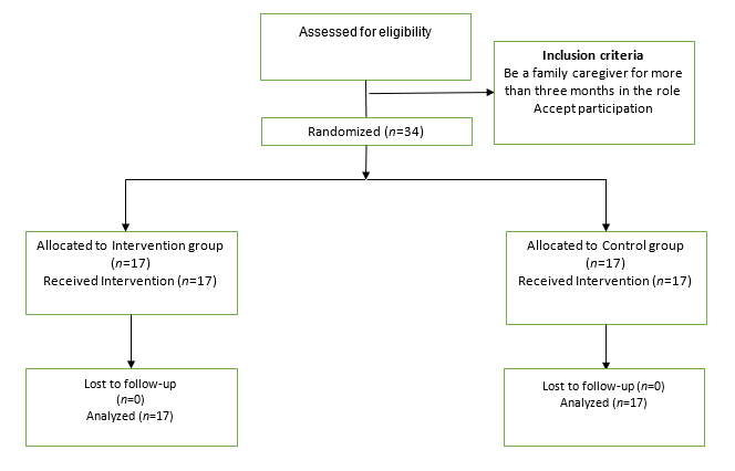 The total number of participants was 34 family caregivers (17 in the intervention group and 17 in the control group). All people who agreed to participate were analyzed in the group that they were initially allocated. (Figure 1)