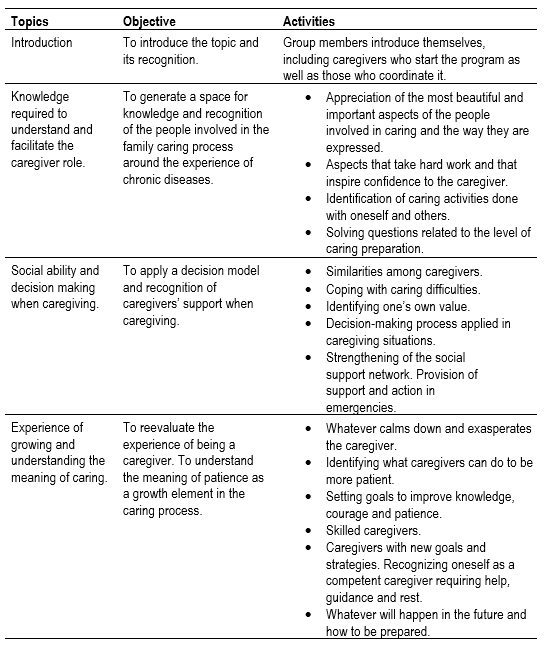 The intervention consisted of the application of a four-topic workshop aimed at improving the family caregiver ability on knowledge, courage and patience, using a booklet designed by the Universidad Nacional de Colombia (13. This workshop was individually applied to each patient in a window of 3 hours at the hospital and was led by a nurse of the research team accompanied by a final year student of the nursing degree. The topics, objectives and activities are described in Table 1. Training related to the chronic pathology was provided to the control group, using educational support material designed by the research team. All participants of the control group were offered to have an intervention after the post-intervention surveys had been applied.