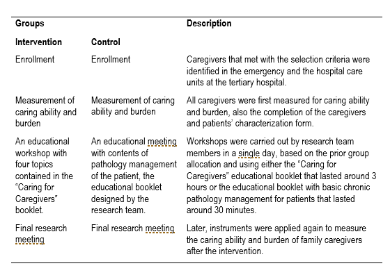 The research team was responsible for the information collection (four nursing professionals, two of them hold a master’s degree in epidemiology and another one holds a postgraduate diploma in university teaching), with the collaboration of three students of the CUIDEN research seedbed group. All these people had prior training on the use of the instrument and the application of the intervention using the educational booklet “Caring for Caregivers”. Initially, hospitalized patients with chronic non-communicable diseases were identified at “Los Comuneros” University Hospital in Bucaramanga. Once the patient had been selected, the caregiver was identified to later define the objective, importance and procedures of the study. Then, the informed consent was signed and the instruments for the collection of sociodemographic information and the caring ability and burden assessment (pre-intervention) were filled out. Later, an educational workshop was carried out on the four topics of the “Caring for Caregivers” program to the intervention group. Likewise, an educational meeting on chronic diseases and their caring was carried out to the control group. Family caregivers were contacted on the next day to apply again the instruments of caring ability and burden assessment (post-intervention).