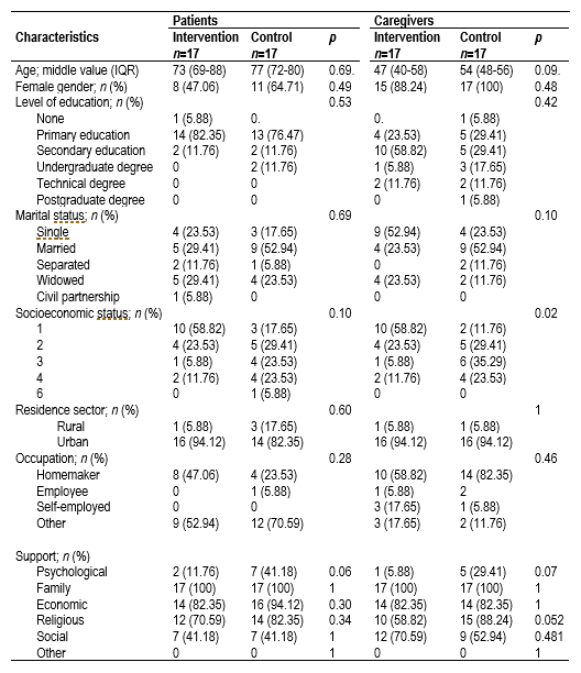Sociodemographic characteristics are described in Table 3. It was observed that there are no significant differences in the demographic and support variables that might interfere with their comparability, except for the caregivers’ socioeconomic status, in which 58.82% of the caregivers in the intervention group are from the lowest strata while it was 11.76% in the control group.