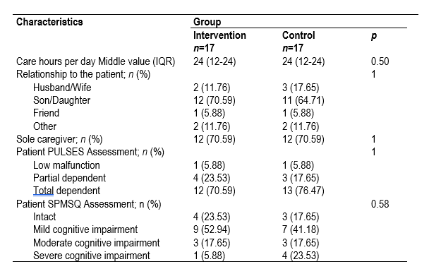 Characteristics of patient caring in each group are shown in Table 4. No statistically significant difference was found among both groups. Regardless of the group, it was predominant the devotion of 24 hours of care per day required by the patient, the relationship with the patient is parent-son in seven out of ten cases, being the sole caregiver in the same proportion. The patient’s dependency level in the PULSES assessment is high and the mental impairment assessment using the SPMSQ scale is from moderate to severe in 23.5% of patients in the study group versus 41.2% in the control group.
