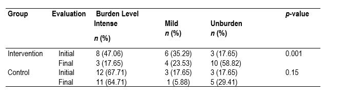 Although both groups improved their percentage of unburdened caregivers from the first to the second evaluation, the difference among the two evaluations is 41.17% in the intervention group while it was 11.76% in the control group, being only statistically significant the difference for the intervention group. When analyzing the data continuously, middle values in the control group were higher and varied than in the intervention group: The initial middle value was 66 in the control group (IQR: 50 - 77) and 53 in the intervention group (IQR: 49 - 62). When evaluating the change of these values, it is statistically significant in both groups, with probability values under 0.01. To evaluate differences among the groups, the final evaluation was subtracted from the initial one. The middle value for the lower half in the intervention group was 7 (IQR: -0.5 - 11) and 5.5 in the control group (IQR: 2.5 - 10), with a probability value of 0.9548, which indicated that the difference was not statistically significant.
