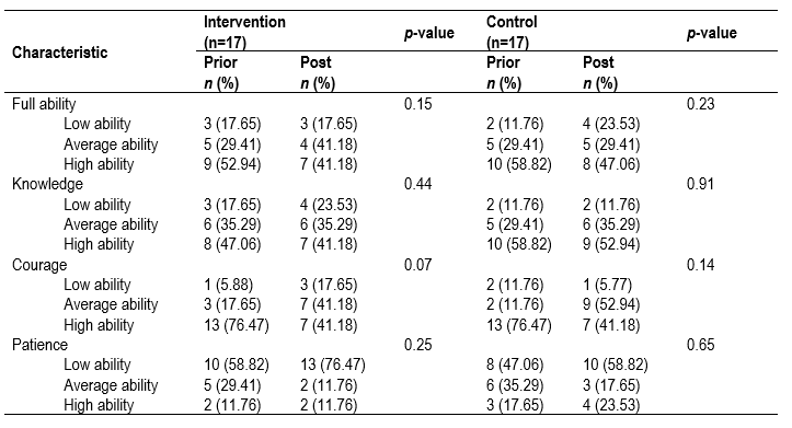 It can be observed in Table 6 that the development of abilities did not show a statistically significant change in the levels of total ability and its dimensions, for both caregivers in the control group and intervention group. Within the evaluated dimensions, patience stands out to have the highest percentages of well-classified ones in the category of low ability in both groups, with percentages from 47.06% to 76.47%.