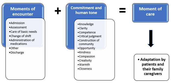 Results.: Patients and their family caregivers usually experience six moments of encounter with nursing that include admission, assessment, satisfaction of basic needs, administration of medication, shift change, and discharge; all of them cross-cut by education and communication. Recognition of experiences during moments of encounter allowed transforming them into moments of nursing care.