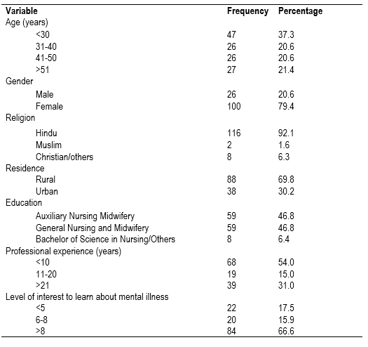 Sample. The sample for the present study was selected using random sampling technique. The nurses who were working under District Mental Health Program were randomly selected from various districts of Karnataka State, to undergo training in an onsite program held at National Institute of Mental Health neurosciences, Bangalore, India. The data was collected from the subjects prior to the training program. The study criteria include a) Registered nurse or Midwife b) working in District Mental Health program or rural health program. The questionnaires were distributed to 162 nurses. Only 146 completed questionnaires were received. However, uncompleted questionnaires (n=16) were discarded and the final sample comprised of 126 with 77.8% response rate.