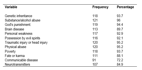 Table 2 presents true responses of the subjects to the knowledge assessment questionnaire. The mean score was 10.88±1.58 on knowledge questionnaire that suggests 91% of the subjects had good knowledge on risk factors for developing mental illness. While majority of the subjects (95.2%) accepted that head injury and physical abuses are the main causes for developing mental illness, 27.8%, 11 % of them believed that mental illness is communicable and occurs due to fate or karma.