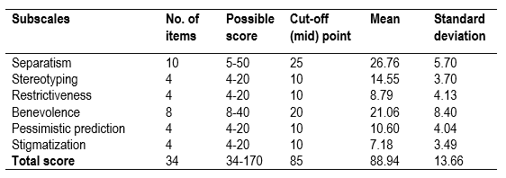 Strengths and limitations. The main strengths of the present study include random sample which can be representative of Karnataka state, using internationally standardized scale and with good response rate (77.8%). The present study was not an exception to certain limitations such as cross sectional descriptive study, small sample size and the data was collected using self reported questionnaires. Hence, our findings may not be representative of the nurses across the country which makes it difficult to generalize the findings. Further, it is necessary to consider the responses of the nurses with caution as there may be possibility of social desirability in their responses. Despite the limitations of the study, we emphasize that our findings offer relatively significant findings about primary care nurses’ attitudes towards people with mental illness. Therefore, our findings may be helpful in developing academic programs to tackle the negative attitudes of nurses towards people with mental illness.