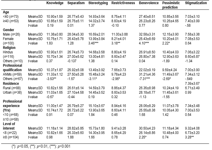 Results. : The findings revealed that majority of the subjects were women (74.4%), Hindus (92.1%) and were from rural background (69.8%). The mean Knowledge score 10.8±1.6 adequate knowledge (maximum possible =12) among 91% of the subjects, and 52% of them hold negative attitudes towards people with mental illness (88.9±13.6). While majority of the subjects hold negative attitudes in ‘Separatism’ (53.5%), ‘Stereotyping’ (73%), ‘Benevolence’ (54%), ‘Pessimistic prediction’ (53%) domains, they hold positive attitudes in ‘Restrictiveness’ (88%) and ‘Stigmatization’ (72%) domains. Women than men endorsed positive attitudes towards persons with mental illness in Stereotyping’ (p<0.001), ‘Restrictiveness’ (p<0.01), ‘Benevolence’ (p<0.001) and ‘Pessimistic prediction’ (t= 2.22, p<0.05) domains. Similarly, Auxiliary Nursing Midwifery found to be less restrictive (p<0.05), more benevolent (p<0.001) and less pessimistic (p<0.05) compared to nurses with higher education (General Nursing and Midwifery and Bachelor of Science in Nursing).