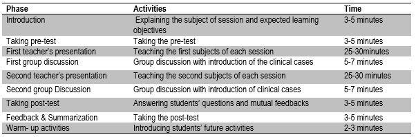This study is an equivalent quasi experimental design conducted in the second semester of 2015 academic year at the School of Nursing affiliated with Yasuj University of Medical Sciences (Iran). The credits of intensive nursing cares were taught via traditional lecture and interactive lecture. This study was conducted following approval of the Nursing Educational Group, Educational Development Office (EDO) of nursing school, and Educational Development Center (EDC) of the mentioned university. Eighteen sessions of class were randomly allocated for then two methods of teaching of which 9 sessions were taught in the interactive teaching method as the intervention group, and 9 sessions were taught in the traditional lecture method as the control group. Table 1 shows the design of interactive teaching. All of the credit subjects were taught by the first author of the present article according to the course plan.