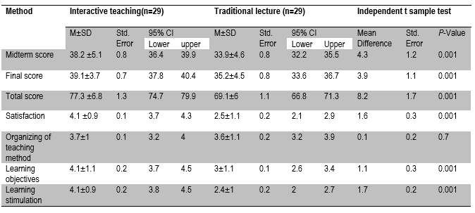 Twenty-nine nursing students participated with the age range of 22-26 years in this study. By the mean score of last five semesters, eight students (27.6%) had a total mean score ≥ 85 (A), fourteen students (48.3%) had a mean score 75-84.99 (B) and seven students (24.1%) were C with a mean score 60-74.99. Midterm score was considered 50% of total score so that 25% of which was related to the lecture method and the remained 25% was related to the interactive teaching method. Final score also included 50% of total score as 25% of final score for the interactive method and the remained 25% for the traditional lecture. The study findings indicated an increase in the students’ mean scores in both midterm exam and final exams for the credit subjects taught through the interactive teaching method compared to the credit subject taught via the traditional lecture method. Independent t-test showed a statistical significant difference in this regard (p=0.001). Significant difference was observed in term of overall satisfaction, learning objectives and learning stimulation of the two teaching methods except organizing of teaching method. In other words, the students' mean scores in terms of satisfaction with the teaching method, learning objectives and learning stimulation for the interactive lecture were more than those in traditional lecture method (Table 2).