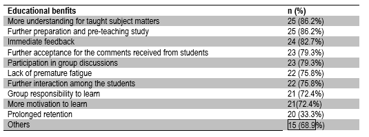 More understanding, further preparation or pre-teaching study, lack of early fatigue, and immediate feedback were the examples of the educational benefits reported for the interactive lecture by the students (Table 3).