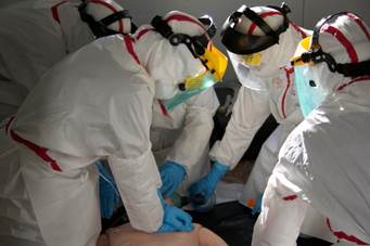 In "conventional" resuscitation, health personnel must perform cardiopulmonary resuscitation techniques according to protocol. (1 However, the consequences of a cardiorespiratory arrest occurring in highly complex situations, such as an incident with biological hazard, are not known. The risk to health personnel necessarily implies the use of personal protective equipment (PPE). The recent Ebola virus epidemic in West Africa2) has confronted health systems around the world with an alarming reality of biological hazard situations. It is increasingly common to attend numerous incidents - either provoked or unanticipated - that generate situations of collective emergency in which certain substances with biological hazard are implicated. These are situations that require a highly specialized response; in short: situations that must be handled comprehensively by the Emergency Services. The usual work of emergency teams is per se difficult, changing and often unfolding before a complex background. Professionals placed in such scenarios with diverse requirements must have received special attitudes and skills from education and training and in providing materials and resources.