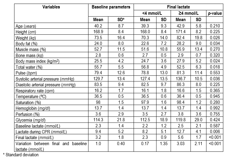 Table 1 shows the mean values and standard deviation of the parameters at baseline and according to the final lactic acid values.