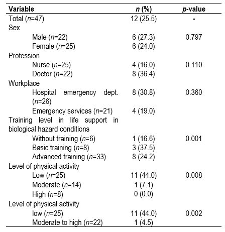 In contrast, statistically significant differences could be observed in the variables of life support training level in environments with biological hazard, where the proportion of subjects with fatigue was greater in the category with basic training (37.5%). By physical activity category performed in the last 7 days, participants with a low level had ten times the probability of metabolic fatigue compared to those with higher levels of activity (44% versus 4.5%, respectively).