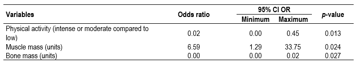 We adjusted a multivariate logistic regression model in which the variables of professional group, workplace (hospital emergencies or prehospital emergencies), age, physical activity level, body mass index, muscle mass and bone mass were included. The prediction capacity of the model was very good, with an AUC of 0.901 (95% CI 0.81-0.99) and p<0.001.