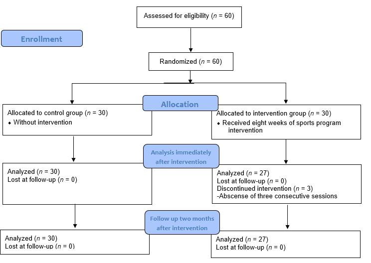 Diagram 1 shows that the 27 individuals from the intervention group vs. 30 from the control group were analyzed during the following moments: immediately and two months after the intervention. The cause of the three losses in the study group was their not attending for three consecutive times to the exercise program sessions.