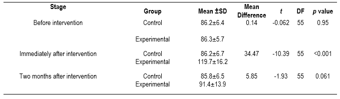 Table 1 shows that no statistically significant difference existed in the general characteristics of the study groups. The characteristics of the whole group prevailed with age between 31 and 40 years (61.4%, mean of 33±2.7 years), married marital status (70.2%), with one to two children (56.1%), monthly income from 5 to 10-million rial (59.6%), official or A treaty employment (31.6% each), with work experience between 6 and 10 years (36.8%), and Bachelor educational level (93%).