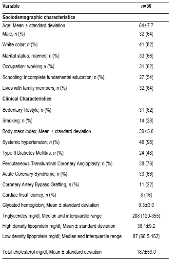 The 50 patients being monitored by the team at the outpatient clinic were included, with no exclusions due to inadequate registration. Of the 50 patient medical records, 64% were from males, mean age 64 (± 7.7) years, white (82%), married (66%), working (62%), with incomplete elementary education (54%) and living with family members (64%). Regarding the clinical characteristics, the patients presented systemic hypertension (96%), diabetes mellitus (48%), acute coronary syndrome (66%), coronary artery bypass grafting (22%) and heart failure (16%). The other data referring to the characteristics of the group of participants are described in Table 1.