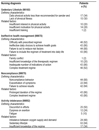It is recognized that the need for greater changes in habits or lifestyle due to the treatment (cessation of smoking and alcohol intake, dietary restrictions and the performance of physical activity) reduces the chances of more adherence.19 The difficulty of incorporating routine physical exercises, indicated by the Sedentary lifestyle (00168) diagnosis, should take into account the repercussion of this practice on the health status of the individual. Evaluating the possible and probable impacts on patients’ daily lives implies broadening the care routine to design goals to be agreed with the patient based on the knowledge of their attitudes, beliefs and health habits - since they explain the reason for sedentary behaviors rather than the practice of physical exercise.10) In this specific group of patients, the related factors that help confirm this nursing diagnosis are Insufficient interest in physical activity and Insufficient motivation for physical activity, which, if their percentages are added, were present in almost half of the sample [24 (48%)]. On the other hand, the Activity intolerance (00092) nursing diagnosis presented, among the defining characteristics and risk factors that interfere in the practice of physical activity, dyspnea on exertion [12 (24%)], fatigue [5 (10%)] imbalance between oxygen supply and demand [24 (48%)], stress discomfort [25 (50%)] and the presence of angina [37 (74%)]. These factors are recognized as restrictive for the performance of physical practices, especially activities with aerobic increase. In addition, stress discomfort seems to be one of the main limitations to physical exercise, not only due to the indication of angina, but also due to the association that many chronic patients (especially our population, in which more than half, 66%, presented acute coronary syndrome) make between this pain and a condition of a major adverse clinical event - emphasizing a potential psychological restriction for the full practice of physical activities.