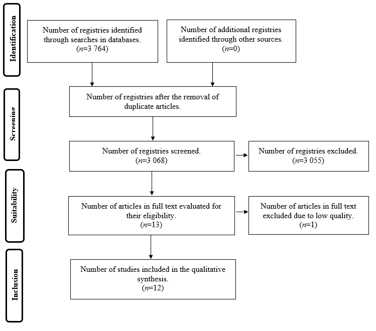 The initial search in the databases selected found 3 068 articles after eliminating articles duplicated in various databases. After a first review of the titles and abstracts 3055 articles were eliminated because of dealing with themes different from the object of study. Thereafter, 13 articles were reviewed in full text, from which one article was excluded because it had an insufficient score after its quality analysis (Figure 1). Finally, 12 articles were included in this review. Table 2 summarizes the principal characteristics of the studies analyzed.