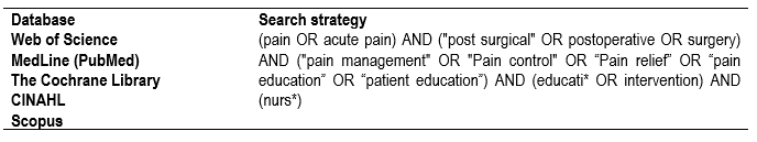 This study conducted a systematic review of randomized clinical trials (RCT), quasi-experimental studies, systematic reviews and meta-analyses that analyzed the effectiveness of educational interventions, conducted during the preoperative and postoperative phases, on the relief and prevention of post-surgical pain. The search included articles published in English and Spanish in the databases of Scopus, Medline (Pubmed), Web of Science, The Cochrane Library, and CINAHL. It included articles to February 2018 to analyze studies reflecting the association between the educational intervention and relief and decrease of post-surgical pain in patients subjected to any type of surgery. Table 1 gathers the search strategy used. In addition, a secondary search was conducted through the references cited by the studies found in our initial search and which were related with the principal objective of the study.