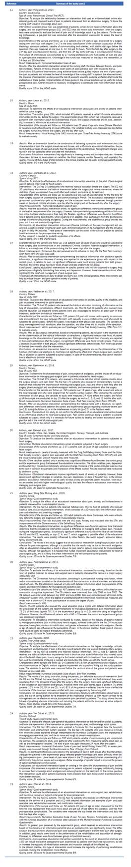 In relation with the type of study, six of the articles analyzed were controlled randomized trials (CRT),14-19 a systematic review and meta-analysis20 and five quasi-experimental studies.21-25 Regarding the geographical area, the studies were conducted in seven countries: South Korea,14 China,15,17,21,25 Canada,16 Finland,18 Norway,19 Spain,22 the United States (23, and Holland.24 The studies included analyzed the effectiveness of different educational interventions aimed at the management and relief of post-surgical pain. In this sense, some of the studies analyzed the effectiveness of educational interventions online,1,3 others on educational interventions aimed at managing pain and anxiety;2,4,5,7 certain studies inquired on the relationship between knowledge on the consumption of opioids and the pain management,6,8,10,11 while others analyzed the effectiveness of an educational intervention in ambulatory surgery (22 or the relationship between pain and post-surgical rehabilitation.12